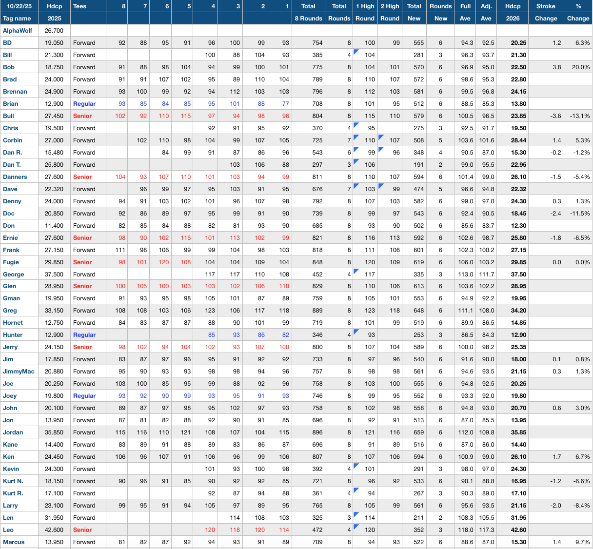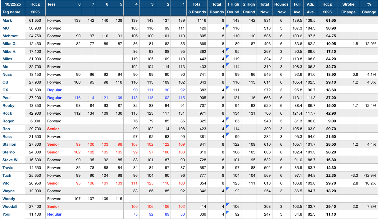 1st year players will have their handicap determined by their official GHIN Index with 3 strokes added for course difficulty and course unfamiliarity. This assumes selection of the Forward Tees. A player selecting the Regular Tees, 3 more strokes will be added (Index +6). A player selecting the Senior Tees than 5 strokes will be subtracted (Index -2).